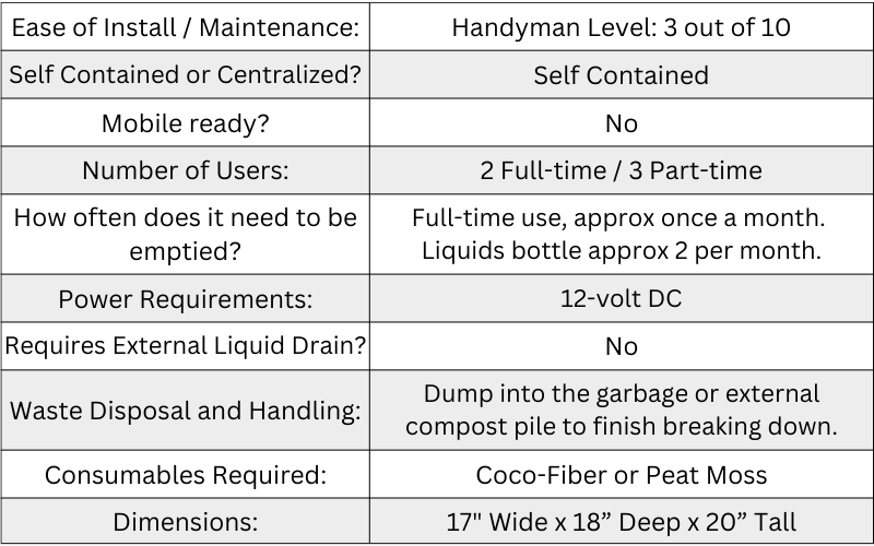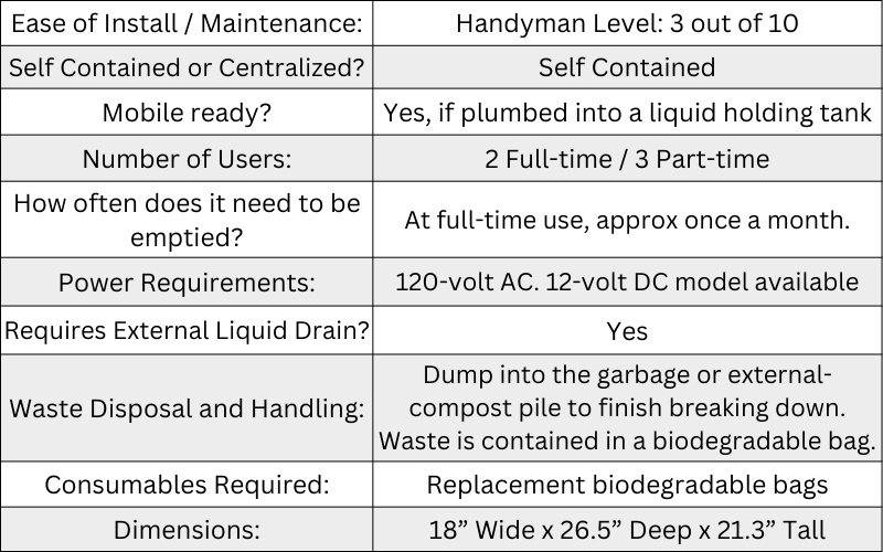 The vent fan is electric 12 volts (or 120 volts with optional transformer for in-home use). The compact design is also a game-changer, taking up much less space than traditional marine or RV toilets, which is especially crucial where space is at a premium. The toilet is also made of high-quality materials, including stainless steel hardware, ensuring it will be durable enough to last for years.