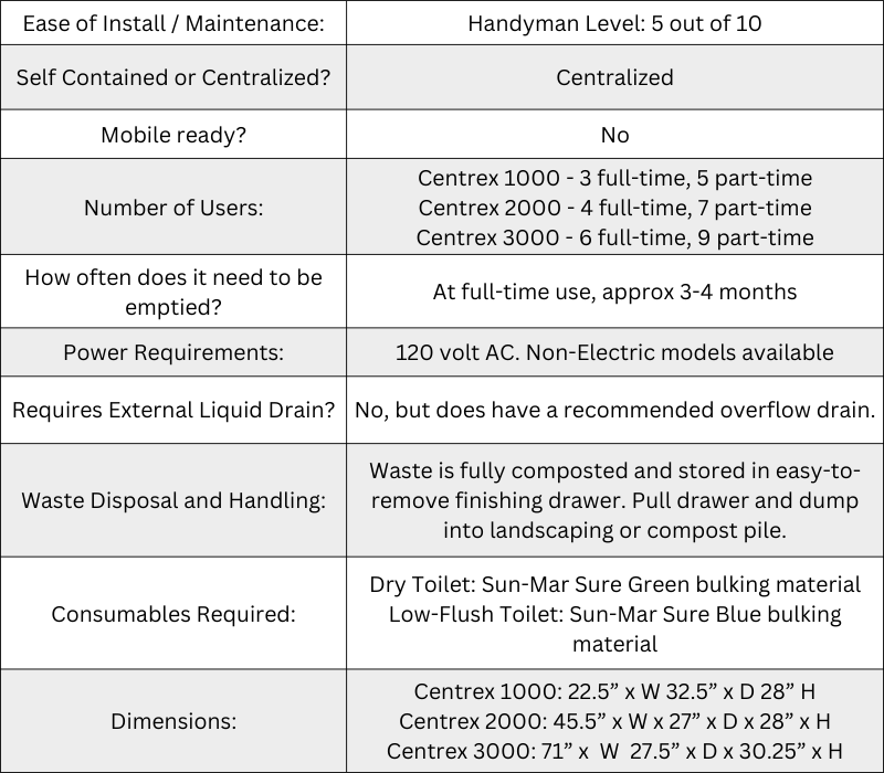 Sun-Mar Centrex units use a central composting toilet system, frequently called a split system. The Centrex 1000, 2000, and 3000 are largely the same system with the exception of capacity. Centrex 1000s are the smallest and Centrex 3000s are the largest.