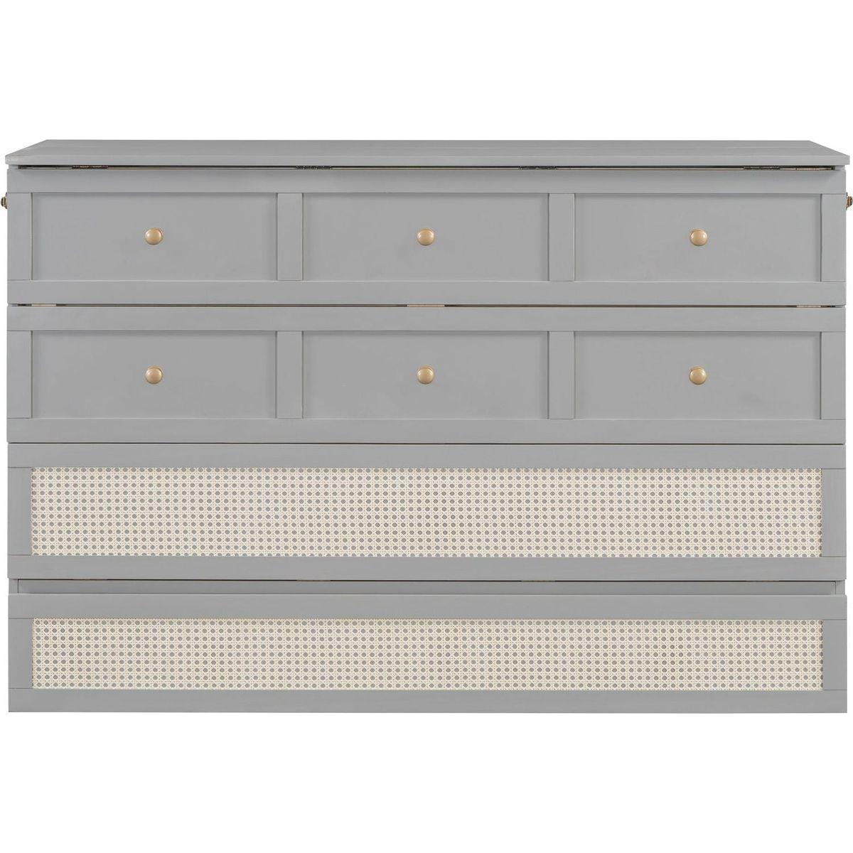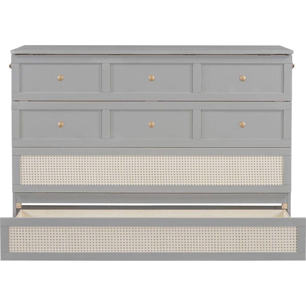 The unique design of the Murphy bed allows it to transform into an exquisite cabinet when folded up, greatly saving space and adding more flexibility to your living space. By fully utilizing space, it makes your room more spacious and tidy.Designed in full size, it can withstand weights of up to 450 pounds, providing a sturdy sleeping environment for you to enjoy ultimate comfort. Whether used by one person or shared by two, it ensures a cozy sleep experience.The bed comes with spacious storage drawers at the bottom, allowing you to easily store bedding, clothes, and other items, keeping your space organized and making daily life more convenient.The front design of the Murphy bed is uniquely crafted, with classic and elegant false drawers on the upper layers and stylish rattan patterned designs on the lower layers. Available in three colors - white, gray, and green - it meets different decoration needs, adding a touch of sophistication to your living space.