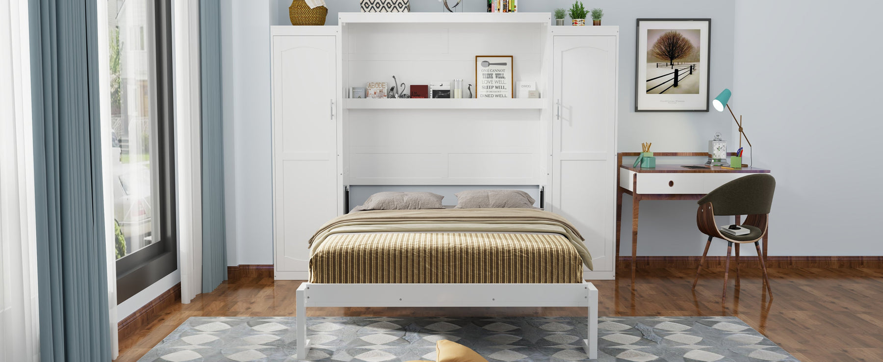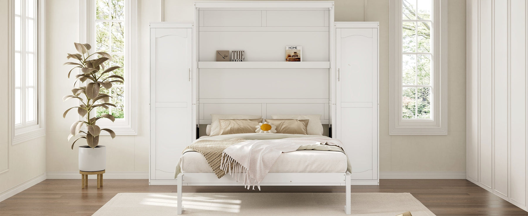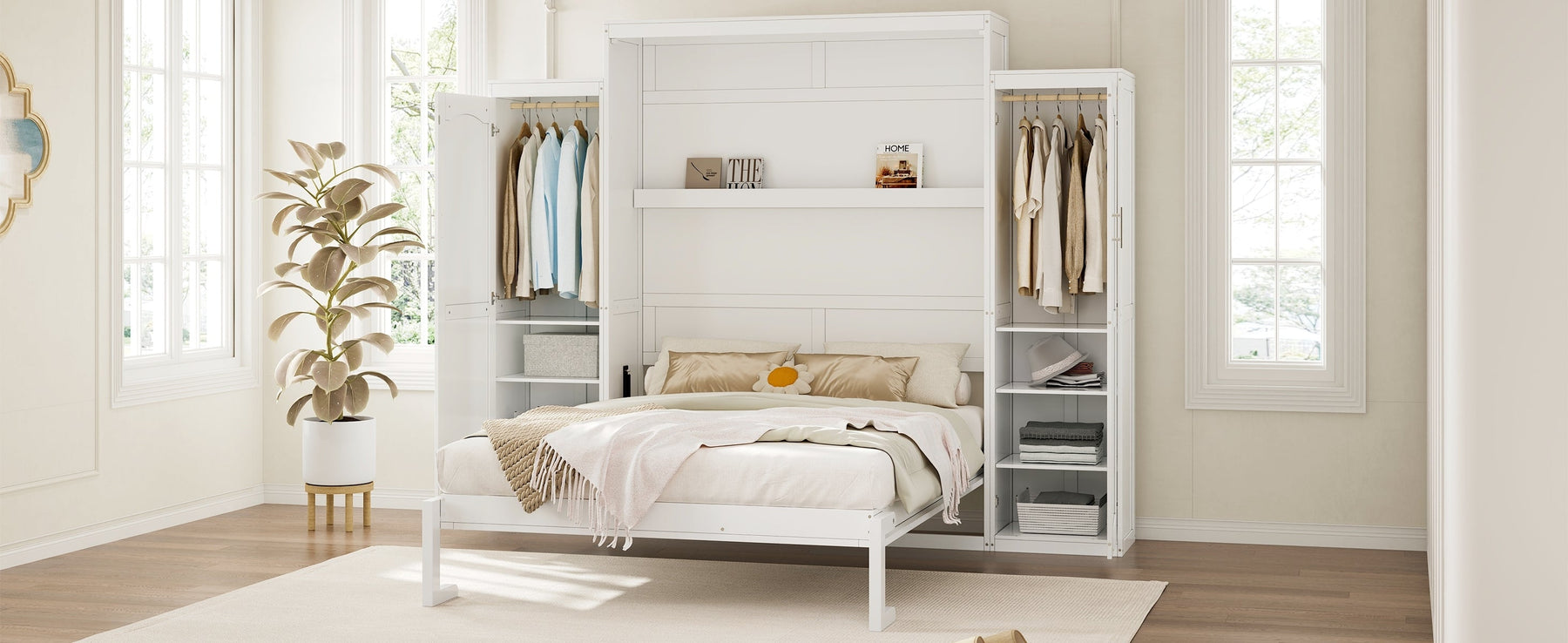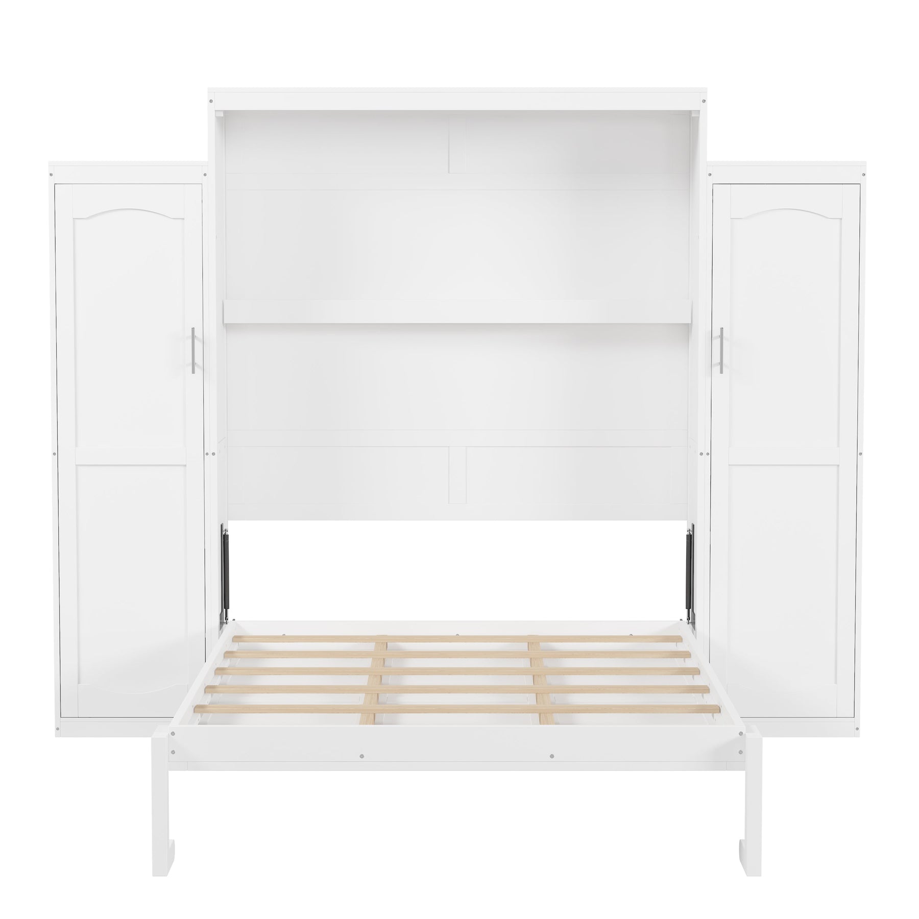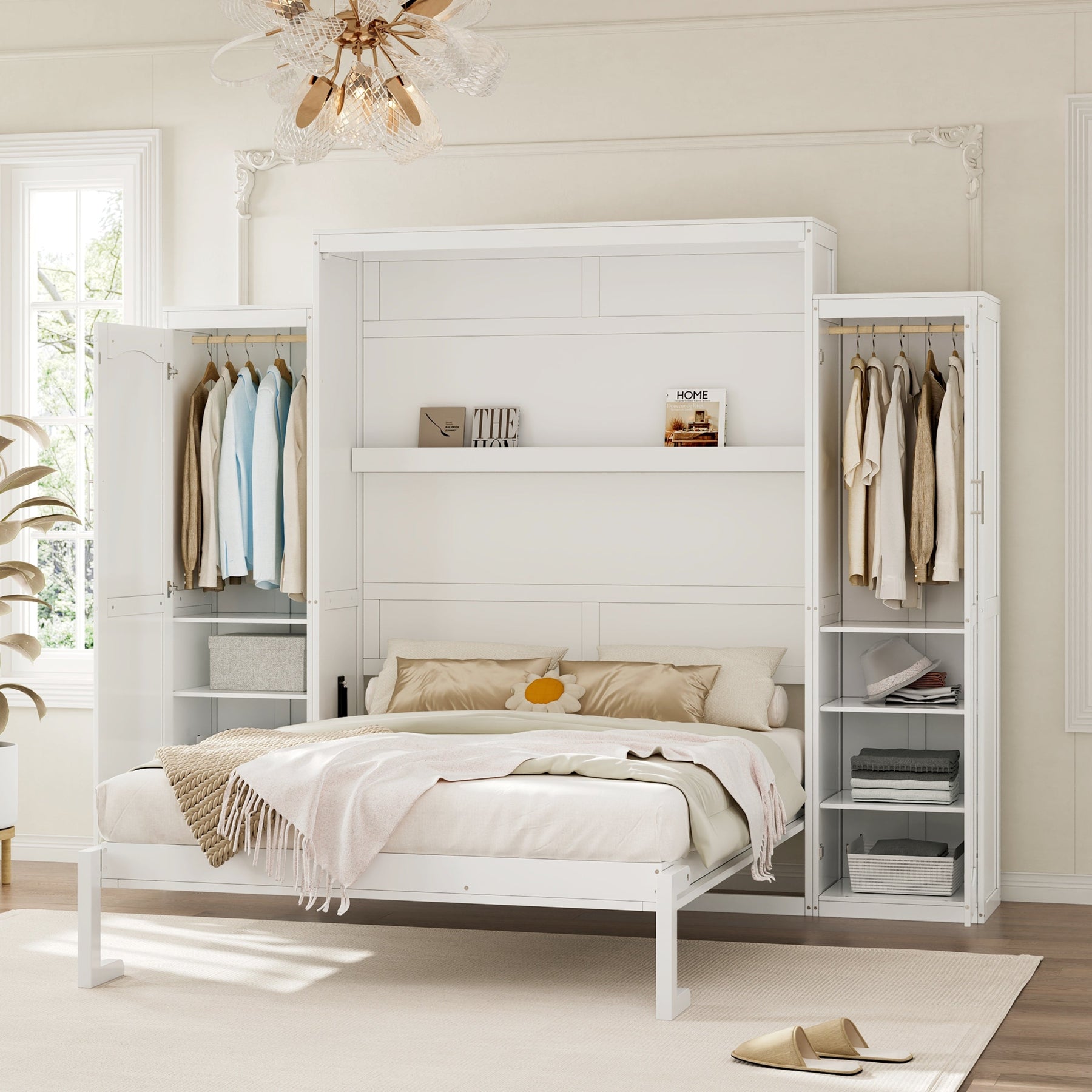 Queen Size Murphy Bed with 2 Wardrobe and Storage Shelf, Multifunctional Foldable Platform Bedframe for Guest-Room, Bedroom, White