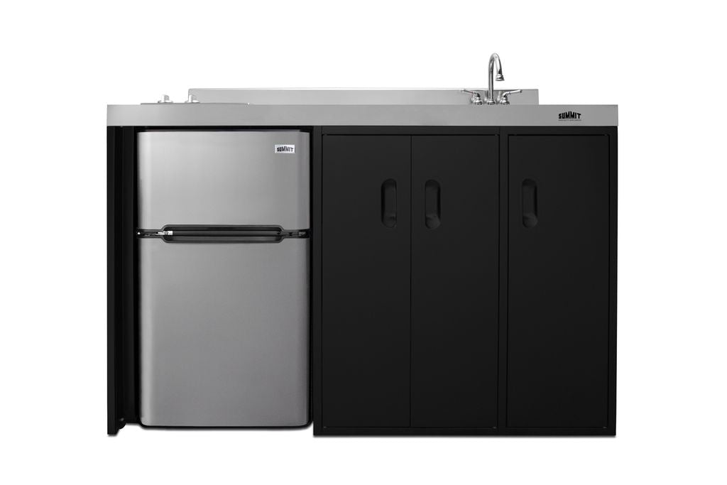 The CK54SINKR is 54" wide with an easy-fitting 24" depth. Its black exterior brings a modern look to efficiency spaces, with added touches of stainless steel on the kitchenette work surface and refrigerator doors. This unit includes a built-in 115V smooth-top cooktop with a rear 7" 900W and a front 5½" 500W heating element. The power cord comes pre-installed for easy setup. The right side of the kitchenette features a compact sink with ready-to-use faucet. A single-door cabinet under the sink includes a removable wire shelf, perfect for storing cleaning supplies, while a French-door style cabinet under the work surface has a solid removable shelf, ideal for dry storage. Two grooved handles on each side allow for easy movement of the unit.