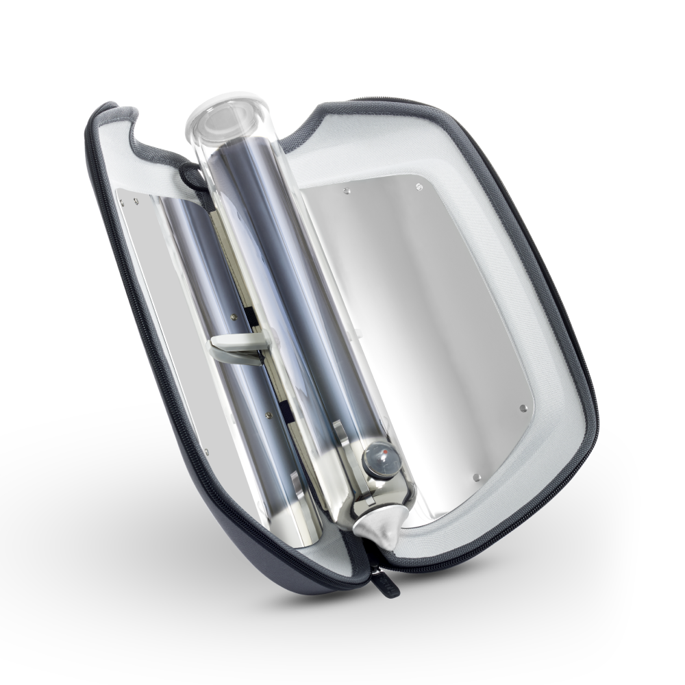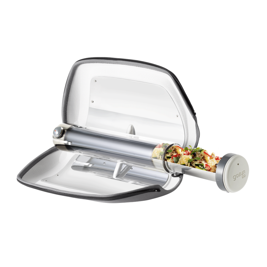 Amazing Portable Solar Oven cooks a meal in 20 minutes or boils water. Great for camping, backpacking, events, and survival. Complete package with Go, Silicone Baking Pans, Solar Dial, Tilt Stand, and Carrying Bag.